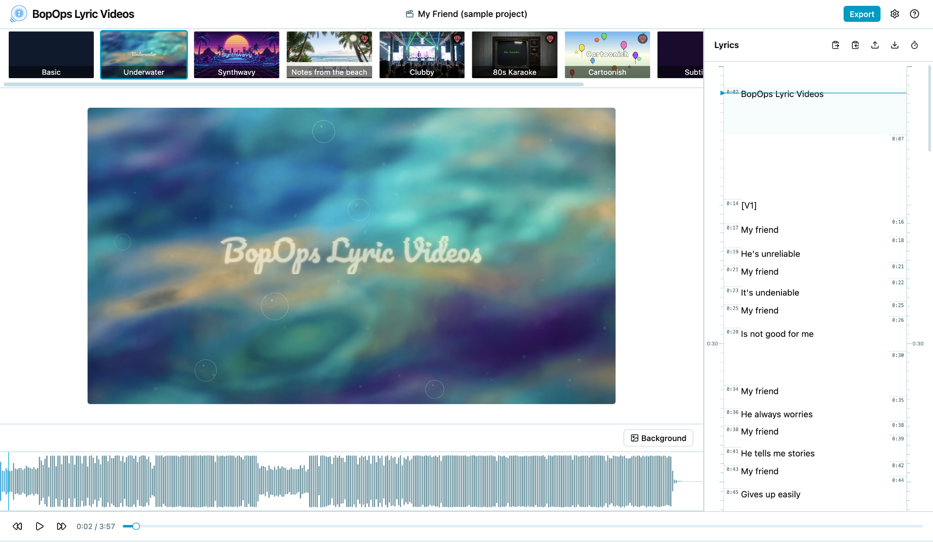 - Hit play and tap the spacebar as each line comes up — BopOps Lyric Videos locks in the timing automatically.